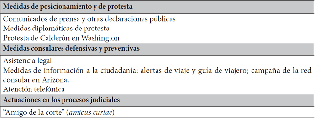 Las respuestas del gobierno de México fueron de diversa índole (tabla 2), las cuales hemos clasificado en tres grandes grupos: el primero son las medidas de posicionamiento y de protesta, que incluyen comunicados de prensa, declaraciones públicas y protestas diplomáticas; el segundo, las medidas consulares defensivas y preventivas, comprenden la protección consular12 y la asistencia consular13 por medio de la asistencia jurídica, un centro de llamadas y el suministro de información; y el tercero, las actuaciones en los procesos judiciales mediante los “amigos de la corte” o amicus curiae. Cada uno de estos grupos son descritos y analizados a continuación al tiempo que se explicita la postura de la cancillería frente a la idea de un posible boicot.