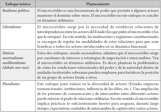 El microcrédito representa una de las formas concretas de implementación o ejercicio de las microfinanzas. Los tres enfoques de análisis que se han presentado en la sección precedente (minimalista, maximalista e integral) coinciden en que el microcrédito es un pequeño préstamo otorgado a personas pobres que no pueden acceder a los préstamos que otorga un banco tradicional o convencional. Esta herramienta ha ido adquiriendo una importancia cada vez mayor como instrumento para el desarrollo de sectores sociales de bajos recursos, que suelen estar excluidos de los circuitos bancarios. El microcrédito se erige como un instrumento para el fortalecimiento de las capacidades productivas, bajo la hipótesis de que hacer de las personas de menores ingresos sujetos de crédito en términos de confianza constituye una estrategia de inclusión social y de combate a la pobreza. La tabla 1 muestra la visión del microcrédito desde algunos enfoque teóricos: