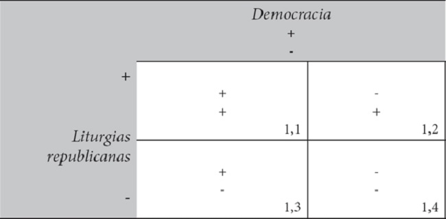 El cuadro 1 puede ayudar a entender, de forma esquemática, cómo estas coordenadas se constituyen en referentes sobre el sentido de las liturgias republicanas y el orden democrático. Para un sector de la opinión el orden democrático mexicano tiene viabilidad en la medida en que se sostengan al máximo las liturgias republicanas post-revolucionarias (1,1). Esta posición, por lo regular, considera que sin estas últimas el orden democrático del país se debilitaría (1,4). Por el contrario, hay quienes consideran que mantener las actuales liturgias sólo contribuye a desgastar el orden democrático (1,2) por lo que sugieren su reducción o cambio para garantizar una mayor democracia (1,3).