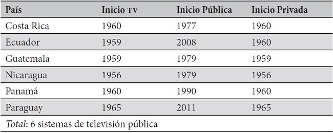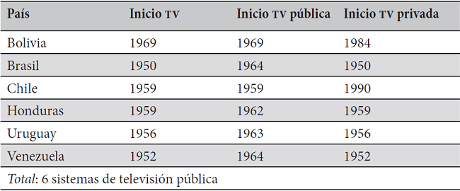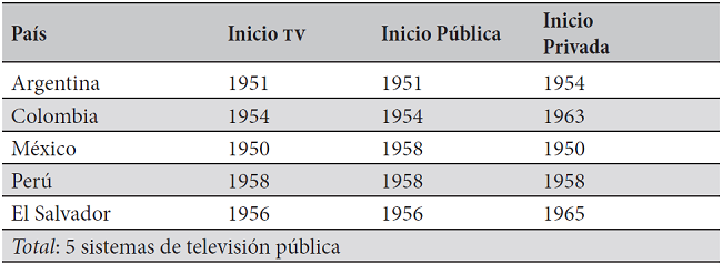 El comienzo del uso de la tecnología televisiva se produce, en trece de las diecisiete naciones de esta muestra, en la década de los años cincuenta. Brasil, México, Argentina, Venezuela y Colombia comienzan transmisiones entre 1950 y 1954; El Salvador, Uruguay y Nicaragua, en 1956; Perú y Chile, en 1958; Honduras, Ecuador y Guatemala, en 1959. Para la siguiente década lo hacen Costa Rica y Panamá en 1960; Bolivia, en 1969, y Paraguay en 1965.