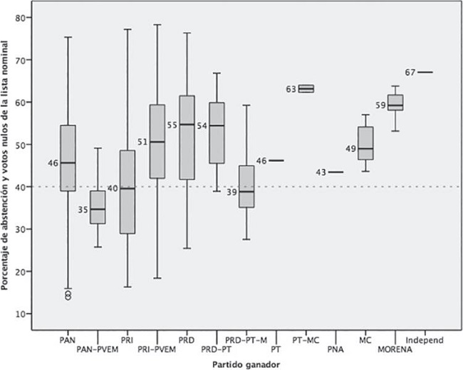 La abstención y el voto nulo tienden a favorecer al PT, al PRD y al PAN, a los partidos de menor preferencia electoral y a las candidaturas independientes: casi a todos, menos al PRI. Una participación media beneficia a las coaliciones, al PRI y al PVEM, mientras que una participación superior a setenta puntos favorece al PRI. Estas consideraciones deben ser tomadas con reserva, pues son bajas las correlaciones o no son significativas.