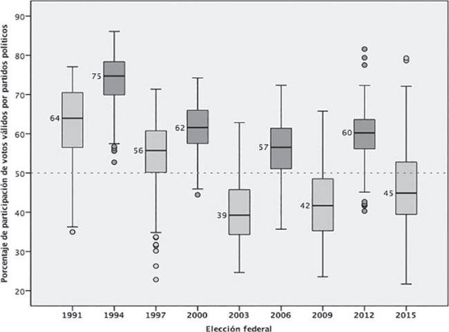 Las nociones de voto nulo y abstención se contraponen a la manifestación concreta por una preferencia reconocida institucionalmente como susceptible de ser depositaria del cargo. Así, configuran dos subconjuntos: votación válida emitida (voto por una candidatura promovida por algún partido político o, como sucedió en el año 2015, de manera independiente) y otro que comprende aquella población que no se pronuncia por un contendiente con legitimidad para detentar algún cargo, sea porque no votó (abstención) o porque sufragó por una opción no reconocida (candidaturas no registradas o votos nulos, los cuales se contabilizan así porque se marcó más de una preferencia o ninguna). El comportamiento de este último subconjunto es de particular importancia para este trabajo, pues representa una forma de participación electoral en la que se emite una preferencia que puede ser legítima o no. Si bien su revisión permitiría hacer un análisis sobre las preferencias políticas, esto es, optar por un determinado programa de acción pública, nuestra revisión intenta responder a una pregunta más simple: ¿la participación electoral sin preferencia alguna puede ser útil para el análisis de la participación política del electorado? Como podemos ver, se trata de dos dimensiones: por una parte, el análisis de la abstención y el voto nulo en la participación electoral en sí misma (en qué medida el procedimiento posibilita que el elector elija) y, por la otra, la dimensión de estos indicadores en relación con la participación política (en qué medida confrontan la legitimidad de las opciones válidas), pues se ha señalado que la abstención y el voto nulo también son formas efectivas para manifestar el asenso o disenso con la democracia procedimental.