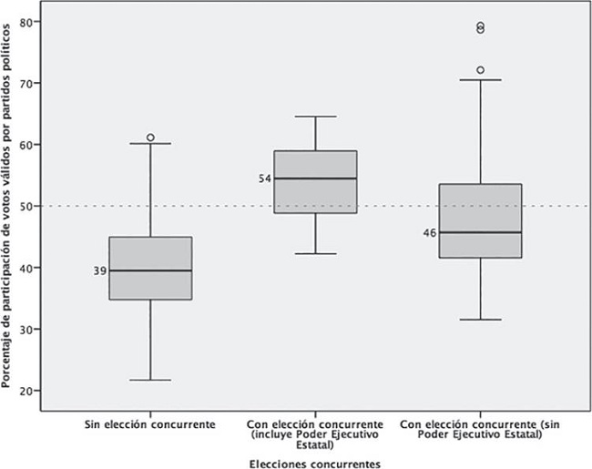 En aquellos distritos donde no hubo elecciones concurrentes se ubica el porcentaje de votos válidos en 39 puntos (Gráfico 3), un índice por debajo de la elección intermedia del año 2009 y similar a 2003, pero ahora más de tres cuartas partes de los distritos se ubican por debajo de 45 puntos. En contraste, ese promedio se elevó donde sí hubo concurrencia, especialmente donde estuvo en competencia la gubernatura.