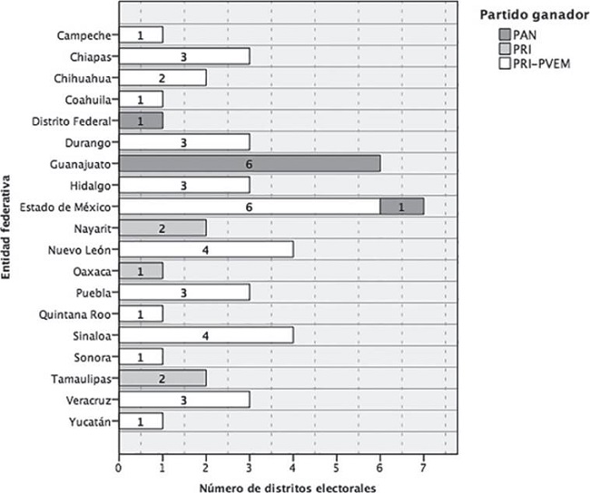 La alternancia a nivel distrital es un avance destacable en nuestro país: hace treinta años un solo partido ganaba casi todos los distritos (por no decir que todos). Después de nueve procesos electorales federales, en 49 distritos de 19 entidades federativas sigue sin ocurrir la alternancia:3 41 de ellos corresponden a la combinación PRI-PVEM y 8 al PAN (Gráfico 4). En el año 2015, nueve entidades no habían tenido nunca alternancia en el gobierno del estado (Integralia, 2015), ocho de los cuales aparecen en el Gráfico 4 (Campeche, Coahuila, Durango, Hidalgo, Estado de México, Quintana Roo, Tamaulipas y Veracruz, faltando Colima).