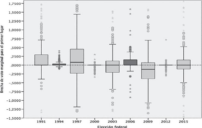 De 1991 a 2012, para el primer lugar la presencia del voto marginal pierde presencia ante el regular (Gráfico 6). En 1991, las tres cuartas partes de los distritos muestran una importante participación del voto marginal (un promedio de 0.316). En las elecciones presidenciales, la competencia entre ambos tipos de votos es tan cerrada que se compensan ambos conjuntos. En cambio, en las elecciones intermedias a partir de 1997, la presencia del voto duro aumenta y resulta determinante en casi 75% de los distritos para el año 2009.