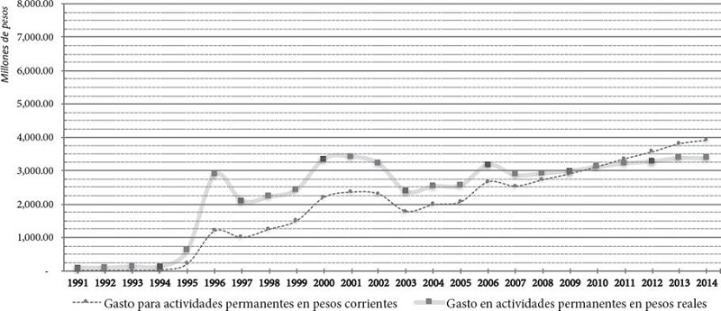 El financiamiento público federal para los partidos ha sido incrementado desde el año de 1991 (IFE, 1990; 1992; 1993; 1994a; 1994b; 1995; 1996; 1997; 2003; INE, 2015b) (Gráfico 7). Los gastos de campaña y la incorporación de más partidos elevaron los recursos disponibles desde 1996. Sorprendentemente, las elecciones presidenciales implicaban una erogación menor respecto de las intermedias. En 2004 fueron acortados los tiempos de campaña y; desde 2007 los participantes dejaron de contratar tiempos en radio y televisión. Se estableció un fondo común que se reparte entre los contendientes, sin importar su número (Chuayffet, 2002; Huchim, 2015, 2008). Así, el costo de las campañas se ha moderado (Gráfico 8), pero no así el gasto corriente de los partidos políticos (Gráfico 9).
