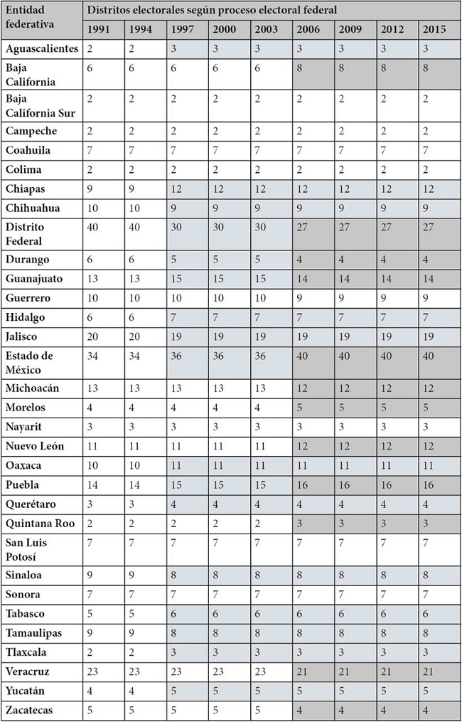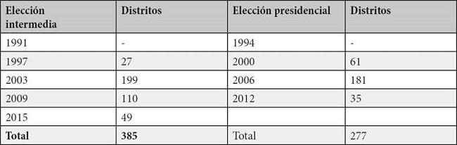 La información corresponde a los resultados para diputaciones de mayoría relativa en los 300 distritos electorales para las nueve elecciones realizadas en el periodo de 1991 a 2015 (CFE, 1988; IFE, 2013; INE, 2015a) Los resultados son comparables de acuerdo con la distritación vigente. Siete entidades federativas no han cambiado su diseño distrital desde 1991; veinte han sufrido dos cambios y en otras cinco han ocurrido tres adecuaciones (Cuadro 1).