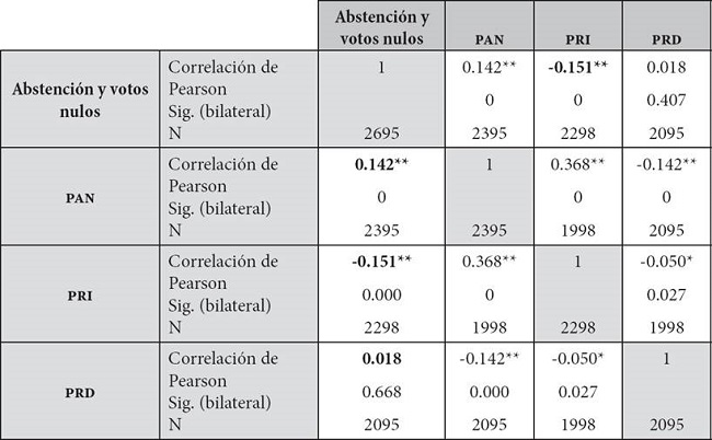 La afirmación no corrobora la correlación rho de Spearman1 entre el resultado obtenido y la votación de los tres partidos mayoritarios, a saber, PRI, Partido Acción Nacional (PAN) y Partido de la Revolución Democrática (PRD) (Cuadro 2). Las correlaciones no arrojan cifras determinantes (la mayor alcanza 0.313). Sin embargo, especialmente respecto de la abstención y el voto nulo, se observa una correlación significativa inversa (p < 0.5) únicamente para el PRI: su votación disminuye conforme aumentan la abstención y el voto nulo. En cambio, no sucede lo mismo con el PAN (correlación positiva) ni con el PRD (casi nula correlación).