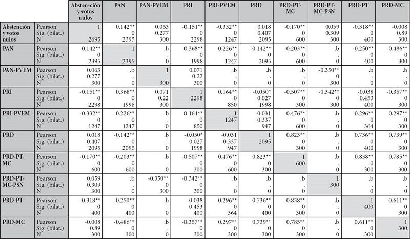 En las coaliciones del PRD, las correlaciones cambian de signo o bien no son significativas. En la coalición del PRI, se mantiene el signo negativo y, además, aumenta la correlación; en este caso, el incremento del abstencionismo y el voto nulo reducen su votación: a mayor votación por la coalición PRI-PVEM, menor abstencionismo y votos nulos.
