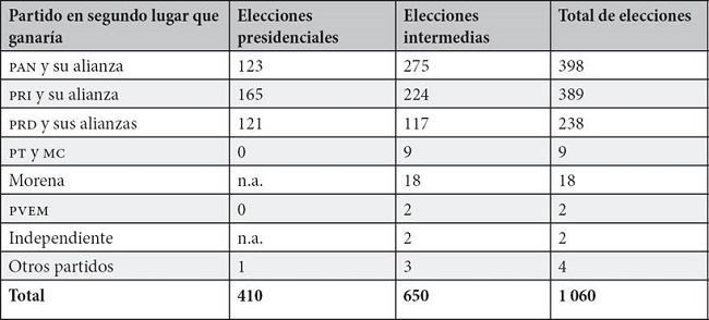 En ambos tipos de elecciones son similares la proporción de voto duro (media de 55.4% en intermedias, 54.5% en presidenciales) y la desviación estándar (28.2 y 29.2). La abstención y los votos nulos muestran cambios relevantes: 52.0% en intermedias y 40.8% en presidenciales. El dato distintivo parece ubicarse en la votación necesaria para ocupar un determinado lugar. Para ganar un distrito en una elección intermedia se necesitan en promedio 48 mil votos; en la presidencial, 66 mil (incrementar en un tercio). Ocupar el segundo lugar representó, en promedio, 31 mil votos y 45 mil (incrementar en la mitad). Alcanzar el tercer lugar requiere de 12 mil votos en la intermedia y 24 mil en la presidencial (duplicar la votación).