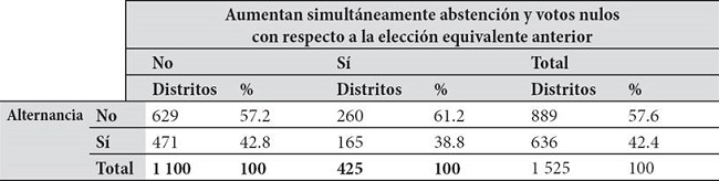 Son equiparables 425 de los 662 distritos para constatar si existe alternancia o no (Cuadro 6);4 los distritos con alternancia son 165 (38.8%). La prueba Chi cuadrada indica que no existe incidencia del aumento de la abstención y los votos nulos en la definición de la alternancia (2.012, un grado de libertad y p = 0.156). En general, parece ser que el aumento o disminución de la abstención y el voto nulo en nada atentan contra la situación prevaleciente.
