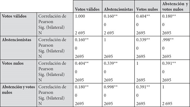Además, la correlación entre nulos y válidos aumenta a un alto índice de 0.433 (p = 0.000): entre mayor es la participación más se incrementa la probabilidad de que haya error en el llenado de la boleta o que se elija deliberadamente anular el voto.