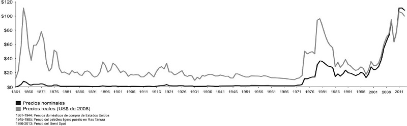 En 1956 estalló la crisis del Canal de Suez, cuando el presidente Nasser hunde deliberadamente varios barcos e impide el paso de los cargueros. Con el control del paso del Canal de Suez, Egipto incrementó sustancialmente los costos a los barcos petroleros que utilizaban esta vía masivamente para abastecerse del petróleo árabe. Surgieron tensiones entre las naciones petroleras y los países de Occidente que dependían cada vez más del oro negro para su consolidación industrial. A partir de la guerra de Yom Kippur, el 6 de octubre de 1973, cuando Siria y Egipto invadieron simultáneamente a Israel, se precipitaron en el Medio Oriente una serie de conflictos que afectaron directamente el precio internacional de petróleo (Gráfico 2). La consolidación de la Organización de Países Exportadores de Petróleo (OPEP) y su embargo a Estados Unidos y Europa Occidental por el apoyo a Israel dispararon en 1974 los precios y éstos se incrementaron aún más por la guerra entre Irán e Irak. Sólo con el aumento sustancial de la producción de crudo en Arabia Saudita se lograron bajar los precios, pero la invasión de Kuwait provocó un nuevo incremento. No todos los factores de presión sobre el costo del petróleo fueron geopolíticos. Las múltiples crisis financieras mundiales incidieron también en la demanda, por lo que los precios volvieron a bajar durante las décadas de 1980 y 1990. A fines de los noventa, una reducción drástica de la producción de la OPEP volvió a presionar el precio a la alza, pero fue sobre todo tras la expansión productiva y la demanda masiva de China cuando el precio de los hidrocarburos escaló a niveles nunca antes vistos (Gráfico 2), con excepción de 1863.