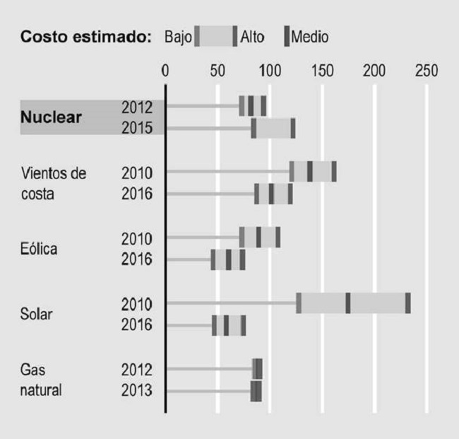 En un artículo del 6 de agosto de 2016, The Economist presentó una gráfica de la National Audit Office, basada en un estudio comparativo hecho en Gran Bretaña sobre los costos presentes en 2015 y futuros de las energías limpias. Los costos futuros por MWh (megavatio por hora) de energía nuclear y de gas, en comparación con las otras fuentes renovables, no pueden competir con la solar y la eólica costa adentro y aún costa afuera (Gráfico 10). Además, el accidente de Fukushima ha aumentado la resistencia entre la población de aceptar la energía nuclear y todavía no existen sistemas seguros para almacenar los desechos nucleares.