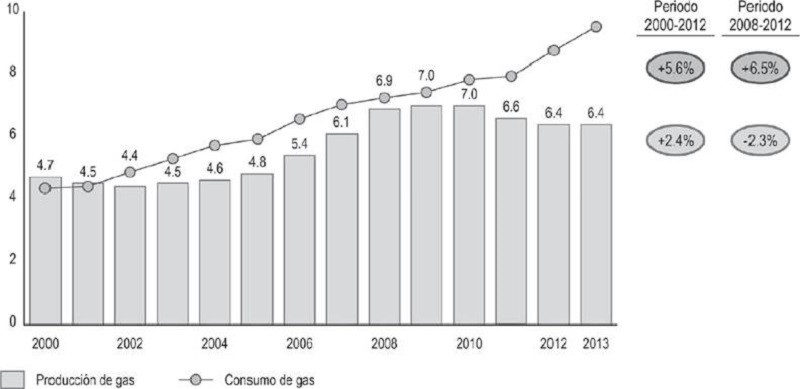 Otro tema relacionado con la seguridad energética es el creciente consumo de gas, utilizado sobre todo para la generación de electricidad, por ser un combustible menos contaminante en comparación con el combustóleo. El Gráfico 12 muestra el constante aumento en el consumo de gas, mientras que la producción se estancó a partir de 2009. Morales (2013: 8) indica que alrededor de 85% del gas está en manos de Pemex y lo usa para la reinyección en pozos y en otros procesos de refinación. Asimismo, a partir de la década de 1990, la CFE ha cambiado parte de la generación de energía eléctrica de combustóleo a gas (IEA, 2015b) y a ciclos combinados que producen ahora más de la mitad de la energía eléctrica nacional (Sener, 2013c: 3) y con menos contaminación.