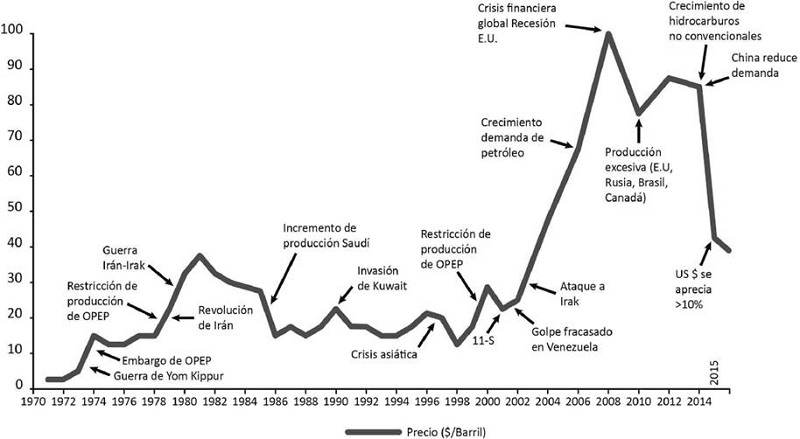 La crisis financiera global de 2008 cambió súbitamente este panorama, pero la rápida recuperación económica llevó el precio real a niveles máximos a partir de 2011. No obstante, una oferta excesiva de combustibles fósiles, sobre todo por los no convencionales relacionados con el petróleo shale en arenas bituminosas y biocombustibles en Estados Unidos, Brasil, Argentina y Canadá, saturaron de nuevo el mercado mundial y produjeron el más reciente colapso en el precio del barril de crudo en 2015-2016. Además, Rusia había entrado como tercer productor y fuerte competidor en el mercado mundial de hidrocarburos y del petróleo ilegalmente vendido a precios irrisorios por el Estado Islámico, así como una participación mayor de Irán en el mercado de crudo, después del levantamiento del embargo que incidió en el colapso del precio a partir de 2014. Finalmente, la desaceleración económica en China, el incremento en la eficiencia energética de los procesos productivos y los motores de los automóviles, así como una mayor disponibilidad de energías renovables han reducido sistemáticamente la demanda del crudo, por lo que se mantiene una sobreoferta de petróleo, que disminuye aún más el precio (Baffes et al., 2015). Por último, dado que la OPEP ya no controla el suministro global del oro negro, Arabia Saudita y los estados del Golfo Arábigo han decidido no limitar su producción, añadiendo más hidrocarburos a la abundante oferta existente.