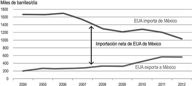 En el pasado, México fue un exportador neto de crudo y abastecía primordialmente a Estados Unidos. Sin embargo, si bien en 2004 el país produjo 3.383 mdbd (millones de barriles por día), su extracción se ha ido reduciendo gradualmente (Sener, 2013b), de tal suerte que en 2015 no alcanzó la meta de 2.4 mdbd propuesta por Pemex, y sólo se extrajeron 2.27 mdbd (Pemex, 2016), mientras que en 2016 la extracción de crudo bajó a 2.15 mdbd (Pemex, 2017: 4). Por otro lado, Estados Unidos está cerca de alcanzar su autosuficiencia en estos recursos, con el desarrollo de biocombustibles y energéticos no convencionales (gas y crudo shale) y de ahí que esté importando menos hidrocarburos del exterior. Si bien México necesitaría exportar más para equilibrar sus finanzas públicas, la falta de inversión, el inadecuado manejo de Cantarrel2 y el agotamiento de otros campos son indicadores de una crisis profunda en la seguridad energética mexicana. Así, mientras que en 2004 México exportaba a Estados Unidos 1.65 mdbd e importaba 0.2 mdbd, en 2012 las exportaciones se redujeron a poco más de mil mdbd y la importación casi se triplicó (Gráfico 4).