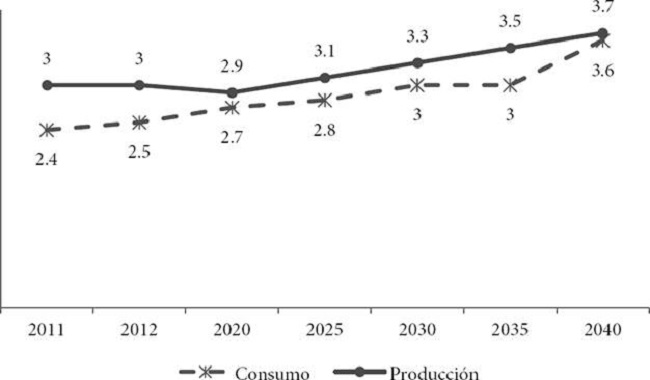 Las proyecciones energéticas sobre México muestran un aumento constante en el consumo que tendrá que cubrirse con mayor producción (Gráfico 6). Esta programación sigue predominantemente vinculada a energías fósiles, aunque con la Ley de la Transición Energética y el Programa de Desarrollo del Sistema Eléctrico Nacional (Prodesen), en 2015 se abre también el campo a las energías renovables. La crisis severa de Pemex, los precios bajos del crudo, la falta de capacidad de refinación y la debilidad técnica y financiera del gobierno mexicano hacen voltear los ojos hacia su socio comercial más importante, Estados Unidos. Pemex (2015) estima que existe crudo suficiente en aguas profundas para cumplir con el abasto interno, pero calcula que los costos de exploración y explotación en aguas profundas sumarán alrededor de 44 mmd (mil millones de dólares). La EIA (2014) ubicaba la producción en alrededor de 3 mbpd y la proyectaba en 2015 a sólo 1.8 mdbd. Con la reforma energética aprobada, calcula que se estabilizará en 2020 en 2.9 mdbd para llegar, en 2040, a 3.7 mdbd. Se trata de un incremento de 75%, lo que cubriría aproximadamente las estimaciones en el consumo eléctrico proyectado.