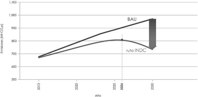 En términos ambientales, Pemex y la Comisión Federal de Electricidad (CFE) no sólo contaban con el monopolio de la generación de energía, sino que son también los mayores contaminadores y emisores de GEI en México (CFE, 2015). Para cumplir con los compromisos voluntarios de los INDC (Intended Nationally Determined Contributions), que el gobierno mexicano asumió en París en 2015 –ahora formalmente NDC (Nationally Determined Contributions)– nuestro país tiene que cambiar sustancialmente su matriz energética, renunciar a su “forma acostumbrada de hacer negocios” (business as usual, BAU) y reducir sustancialmente sus emisiones de GEI para alcanzar, a partir de 2025, la ruta trazada en su compromiso con los INDC (Gráfico 7).