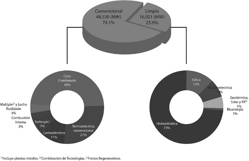 La Asociación Mexicana de Energía Eólica (Amdee, 2016) informa acerca del crecimiento reciente en la energía eólica, que aumentó nueve veces entre 2001 y 2011. En 2013 existían 31 parques eólicos, cuyos 1 570 aerogeneradores produjeron 2 551MW, con una inversión de 5.1 MMD. Amdee estima alcanzar en 2020 una producción de 15 000 MW. En 2016 se inauguró en el Estado de México un parque solar. En cuanto a inversiones privadas limpias en construcción, se están desarrollando 13 proyectos de energía renovable: 4 eólicas con una capacidad de producir 200 MW; 5 fotovoltaicas de 112.2MW; 2 de biomasa de 20 MW; 1 minihidráulica de 5 MW, y un biocombustible que generará 438 000 galones/año. Además, entraron en concurso dos proyectos de gas natural, que producirán 402 MW, y uno de geotermia (SHCP, 2015). El Prodesen establece un escenario bajo en cuanto a la planeación y alto en la generación de energías limpias (Gráfico 11) (Sener, 2015). En la ronda 1 de subasta eléctrica, la CFE comprará un total de 5 385 gigawatts/hora (GWh) de electricidad y 5.426 millones certificados de energía limpia (CEL).