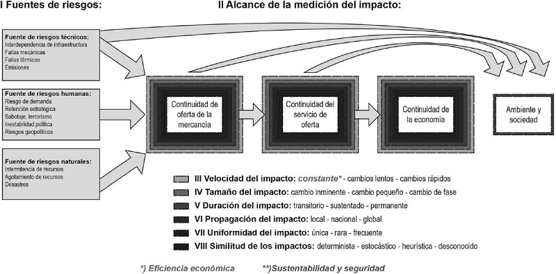 Winzer (2011) integra esta complejidad y propone un modelo dinámico de análisis de la seguridad energética. Interrelaciona los factores de demanda, oferta, desarrollo económico global, ambiente y sociedad con las fuentes de riesgos tecnológicos, humanos y naturales. El conjunto de estos elementos puede generar impactos en velocidad, tamaño, duración, expansión, particularidad y certidumbre sobre la seguridad energética (Figura 1). Dependiendo de la eficiencia productiva y económica, la seguridad energética se mantiene en el rubro de sustentabilidad y de seguridad. Pero si cualquier filtro muestra cambios o los riesgos aumentan por eventos hidrometeorológicos extremos,1 entonces se alteran la seguridad energética y la seguridad económica, y se afecta la seguridad ambiental, con lo que se generan riesgos a la sustentabilidad del entorno natural (Beck, 2009; 2011).