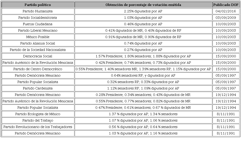 Si bien esta breve descripción no hace justicia al impacto que tuvo el umbral electoral en el SP, sí hace evidente la necesidad de revisar, en estudios interdisciplinarios, cuáles eran los condicionantes sociales y políticos del momento histórico que vivía el país y que han tenido como resultado que en México, en los últimos 25 años, 20 partidos hayan perdido su registro, como se muestra en el siguiente cuadro.