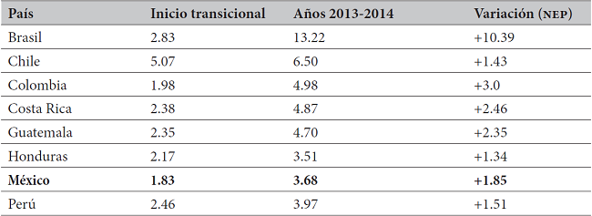 En la reforma política electoral de 2013-2014, el umbral electoral se inscribe en los indicadores de prescripción de políticas que buscan normar o modelar una concepción de gobernanza democrática, asumiendo de antemano estándares institucionales de gobernabilidad. De ahí la importancia de enmarcar este tipo de estudios en la perspectiva comparada, no sólo diacrónica, sino también espacial. En el cuadro 1 mostramos datos de algunos países latinoamericanos, entre los cuales México se sitúa en un promedio relativamente bajo de número efectivo de partidos en la competencia electoral, lo que indica su tendencia al tripartidismo.