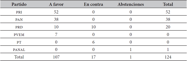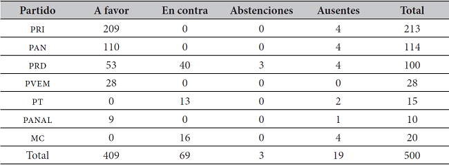 El debate parlamentario sobre la reforma a los artículos 41 y 54 constitucional (fracciones i y II), que estableció el aumento de 2 a 3% de la votación válida emitida para que un partido político tenga RP, puso de manifiesto los intereses políticos de los legisladores para expresarse a favor o en contra de la modificación al umbral. Las bancadas pertenecientes al PAN y al PRI, con mayoría en las comisiones de ambas cámaras que dictaminaron las iniciativas, votaron a favor de la modificación, mientras que los legisladores de los partidos minoritarios estuvieron en contra: fueron los casos de legisladores del PT y MC, a los que se unieron algunos del PRD ante la incertidumbre de la pérdida del registro (véase historial en el cuadro 3).