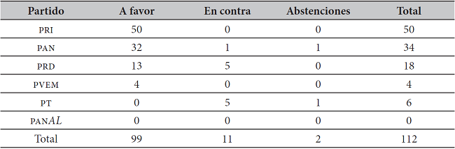 Continuando con el proceso legislativo, después de aprobadas en lo general y en lo particular todas las modificaciones aceptadas, el dictamen se turnó a la Cámara de Senadores como cámara de origen (CPEUM, 2017), el mismo 5 de diciembre de 2013, y el presidente de la Mesa Directiva la turnó a las Comisiones Unidas de Puntos Constitucionales; de Gobernación; de Reforma del Estado; de Estudios Legislativos, Primera; y de Estudios Legislativos, Segunda. El 13 de diciembre de ese año se presentó la minuta ante el Pleno del Senado en los mismos términos en los que fue enviada por la Cámara de Diputados para su discusión y votación. Se muestran los votos emitidos por cada partido en el cuadro 8. De los 128 representantes que integran el Senado, 16 estuvieron ausentes.
