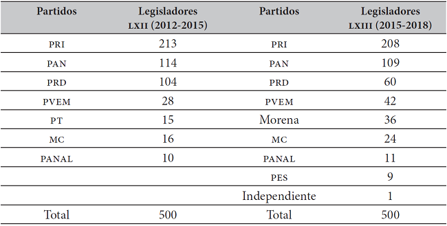 La LXII Legislatura de la Cámara de Diputados estuvo integrada por siete partidos políticos y, como se observa en el cuadro 9, la LXIII Legislatura está integrada por ocho (más el diputado independiente). Sobre ello precisamos dos puntos: el primero, que si bien el PT no tuvo representación en la Cámara de Diputados, ya que en esas elecciones de junio de 2015 no alcanzó el 3% requerido, sí pudo obtener el 3% del umbral electoral para mantener su registro como partido político nacional, con las elecciones extraordinarias del distrito electoral 01 de Aguascalientes de diciembre de 2015. En segundo lugar, dos nuevos partidos políticos de carácter nacional -Movimiento de Regeneración Nacional (Morena) y el Partido Encuentro Social (PES)- mantienen su registro y la RP, al alcanzar el umbral electoral estipulado en la reforma político-electoral de 2013-2104.4