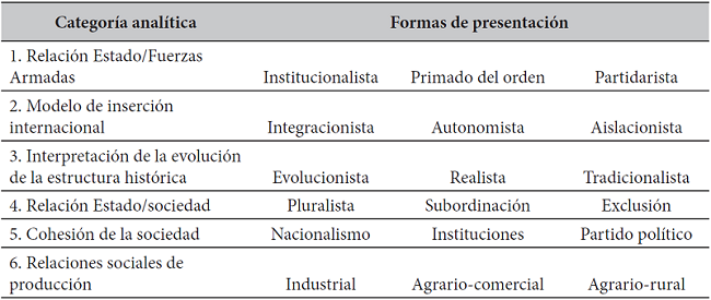 Las principales formas de presentación de las seis categorías analíticas utilizadas para examinar la ideología partidaria colorada se presentan en la tabla 1: