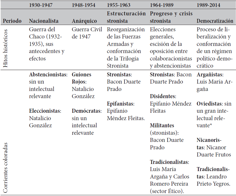 El análisis de los intelectuales es efectuado con base en cinco periodos históricos, listados a través del establecimiento de hitos que fomentaron las principales divisiones partidarias. Los hitos se refieren al panorama construido a partir de una revisión bibliográfica de la evolución histórica paraguaya. Para cada periodo se identifican los principales grupos políticos del coloradismo y sus respectivos representantes intelectuales orgánicos. Este análisis será concatenado con la apreciación de los documentos partidarios que contienen las directrices ideológicas de los grupos políticos estudiados, a fin de observar la influencia de la actividad intelectual en las decisiones partidarias.