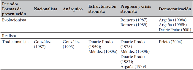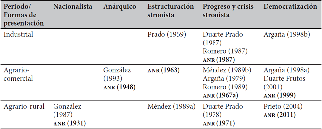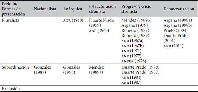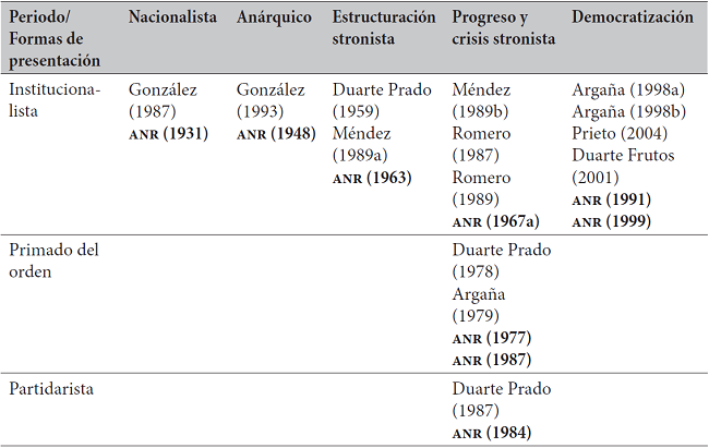 Presentaremos en la secuencia las categorías que se usaron para analizar las narrativas de las obras estudiadas y también sus principales formas de presentación posibles. Se define el periodo abordado por la investigación, con sus respectivos hitos fundamentales, además de los principales grupos internos del Partido Colorado cuyos intelectuales orgánicos y sus obras son examinados en las secciones siguientes.