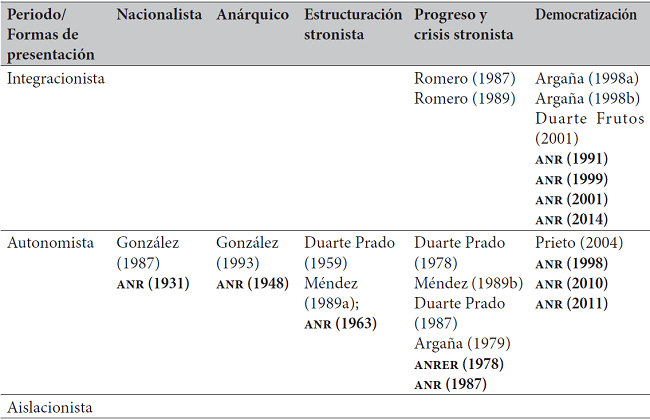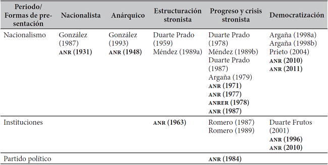 Los documentos partidarios en su mayoría afirman el carácter nacionalista del coloradismo. En el periodo de estructuración stronista vemos un desacuerdo entre el documento partidario y los análisis de los intelectuales, pues el partido buscaba postular la necesidad de mantener la institucionalidad para sostener el régimen, apuntando incluso a su perfeccionamiento a través de la promulgación de una nueva Constitución. Otro documento que diverge de los argumentos intelectuales y de los demás documentos en su periodo es Verdades Necesarias, en el que el Partido Colorado se afirma como sostén de la cohesión social (ANR, 1984). No obstante, tal concepción ya es modificada en el documento siguiente. Y en el periodo de democratización visualizamos la presencia de las concepciones nacionalista e institucionalista en los documentos, posibilitando la acomodación de los disensos.