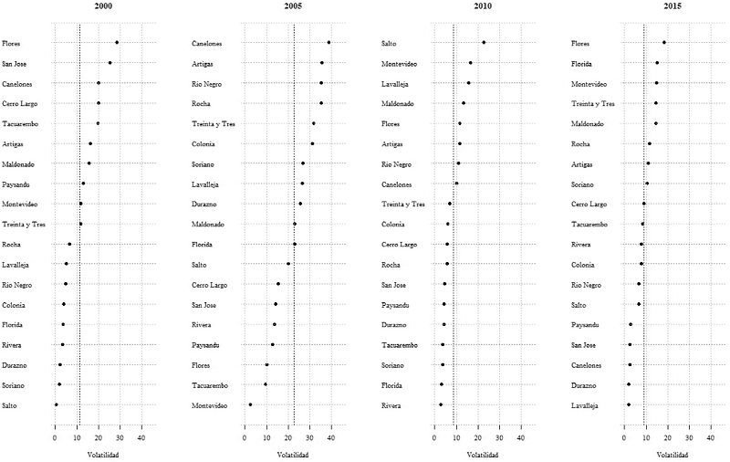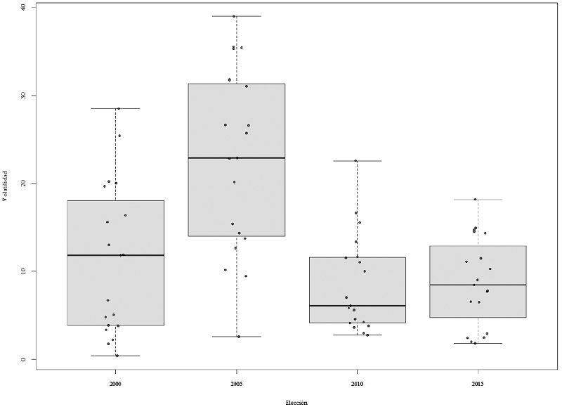 En el gráfico 1 antes presentado se observan los niveles de volatilidad en cada una de las cuatro elecciones contempladas en el estudio. Como puede apreciarse, en promedio la elección con mayor nivel de volatilidad general fue la de 2005 (22.69), considerablemente mayor que la de 2000 (11.29) y que las de 2010 y 2015, que presentaron un nivel de volatilidad casi idéntico (8.57 y 8.80, respectivamente). Asimismo, tanto la elección de 2000 como la de 2005 son las que mayor variación presentan entre los departamentos, mientras que la volatilidad registrada en las elecciones de 2010 y 2015 están más concentradas sobre el valor promedio.