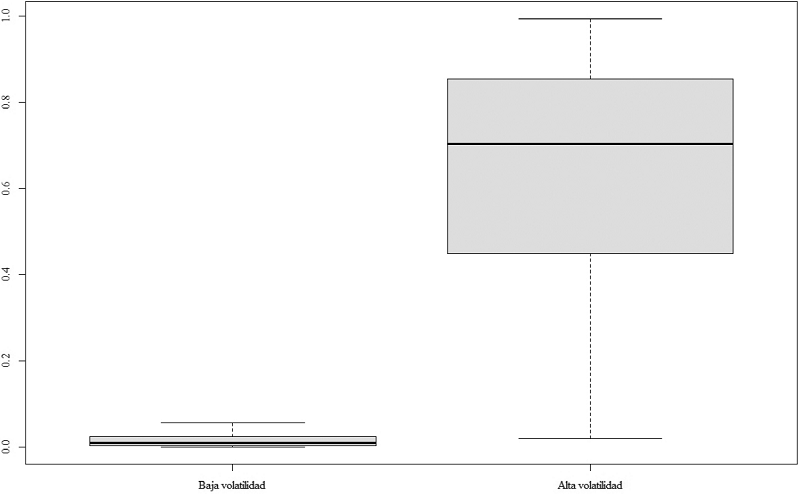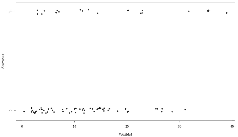 A su vez, en el gráfico 2 se puede visualizar esta relación. La alternancia es una variable discreta que asume el valor 1 cuando hay cambio en el partido de gobierno y 0 en caso contrario. Mientras, la volatilidad es una variable continua, medida por el índice de Pedersen. En este gráfico se observa que hay más casos de no alternancia (55 contra 21). Sustantivamente, la distribución de los puntos en el gráfico refleja que la relación entre estas dos variables no es automática. Por el contrario, si bien existen casos de alternancia con alta y baja volatilidad, la concentración de puntos en el cuadrante inferior izquierdo del gráfico 2 muestra que es claro que con baja volatilidad la alternancia es muy poco probable.