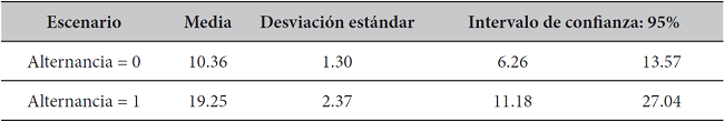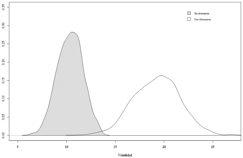 Una forma adicional de analizar la relación que existe entre volatilidad y alternancia es hacer uso de simulaciones de Monte Carlo para estimar cantidades de interés e ilustrar de este modo qué debemos esperar bajo distintos escenarios de interés teórico y plausibilidad empírica. Para ello esta sección presenta dos simulaciones con dos escenarios cada una. La primera presenta a la volatilidad como variable endógena y se observa cuáles son los niveles de volatilidad esperados, asociados a dos escenarios polares: uno con alternancia de partido en el gobierno, y otro escenario idéntico, pero sin alternancia. Como puede apreciarse en el cuadro 4, la simulación de ambos escenarios pone de manifiesto que existen diferencias significativas. Cuando no existe alternancia, la volatilidad promedio alcanza un valor de 10.36, mientras que en un escenario con alternancia, la volatilidad promedio es de 19.25. Esto es, la volatilidad promedio con alternancia es casi el doble que cuando no hay alternancia. Un aspecto que cabe destacar es que el promedio general de volatilidad para los datos observados es de 12.84; es decir, muy similar al límite superior del intervalo de confianza del escenario sin alternancia. A su vez, el gráfico 4 muestra las distribuciones de probabilidad de la volatilidad electoral en ambos escenarios. Los resultados de esta primera simulación contribuyen a reflejar que, en promedio, la volatilidad electoral en elecciones subnacionales en Uruguay es compatible con la continuidad del partido en el gobierno. Además, esto es consistente con la frecuencia de los datos: sólo en un tercio de las setenta y seis elecciones estudiadas se produjo alternancia.