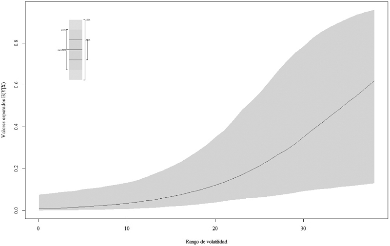 La respuesta debe buscarse en los escenarios expuestos en las simulaciones. Un mercado electoral con baja volatilidad está asociado con la continuidad del partido de gobierno con una probabilidad cercana a 1. En cambio, cuando la volatilidad es alta, el resultado en términos de alternancia es básicamente indeterminado, pues la probabilidad de que no exista alternancia es de casi 40%. El gráfico 6 ilustra este punto con claridad. Como se observa, el intervalo de confianza (95%) se hace cada vez mayor a medida que aumenta el nivel de volatilidad. En consecuencia, no es posible afirmar que la volatilidad y la alternancia estén asociadas del mismo modo para cualquier nivel de volatilidad. Si bien la dirección de la relación entre ambas variables es siempre lineal (a medida que crece la volatilidad aumenta la probabilidad de alternancia, y viceversa), la confianza en la estimación puntual de la probabilidad de dicha asociación es condicional al nivel de volatilidad.