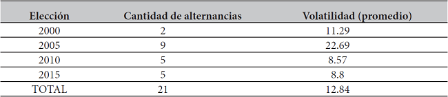 Empíricamente, la elección de 2005 presentó una volatilidad promedio de 22.69 y se produjeron nueve cambios de partido en el gobierno departamental, mientras que con una volatilidad promedio de 9 puntos en las elecciones de 2010 y 2015, se produjeron cinco cambios de partido en el gobierno, en cada una. Esta comparación abona la idea de que, a más volatilidad debemos esperar en promedio más alternancia.