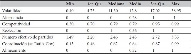 Por otra parte, la presencia de fallos de coordinación puede afectar los niveles de volatilidad, en la medida en que una oferta descoordinada obstaculizaría la capacidad de los votantes para actuar estratégicamente (Cox, 1997), por lo cual habría mayor inestabilidad en el sistema. Por ejemplo, si dos partidos de similar orientación ideológica presentan una oferta descoordinada, es probable que los votantes se enfrenten a un dilema de acción colectiva para decidir a cuál de los candidatos (con preferencias ideológicas semejantes) apoyar con su voto. Esto puede redundar en cambios en las decisiones de voto, que afectarán el nivel agregado de volatilidad electoral. Para controlar este efecto se incorpora al análisis empírico una variable que mide el nivel de coordinación en función del cociente entre el segundo y el tercer partido más votado (el second/first ratio) (Cox, 1997). El cociente varía teóricamente entre 0, cuando la coordinación es perfecta, y 1 cuando existe un fallo de coordinación, dado que la votación del tercer partido sería similar a la del segundo, lo cual -de acuerdo con la regla de mayoría simple- indicaría una violación del límite superior de M+1 candidaturas viables en equilibrio (donde M es el tamaño de la circunscripción).