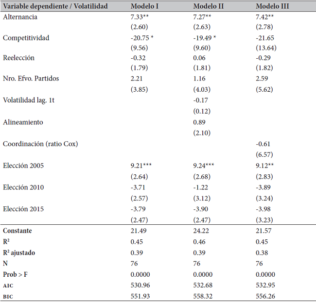 Con este propósito, se estimaron tres modelos con distintas especificaciones y controles. En todos ellos, la variable dependiente es el nivel de volatilidad electoral y la principal variable independiente es la alternancia. En este punto es necesaria una aclaración, dado que es difícil determinar hasta qué punto la alternancia es una causa, antes que una consecuencia, del cambio electoral. Empíricamente, puede decirse que la alternancia es una consecuencia del cambio electoral, pues es el cambio neto en las decisiones de voto (esto es, la volatilidad) lo que puede dar como resultado la alternancia del partido en el gobierno. Sin embargo, desde el punto de vista teórico, el vínculo entre volatilidad y alternancia no es tan evidente. Como ya hemos señalado, puede existir cambio electoral (volatilidad) sin alternancia y, viceversa, puede ocurrir la alternancia con niveles extraordinariamente bajos de volatilidad. En consecuencia, no postulamos una relación de causalidad entre alternancia y volatilidad electoral. En cambio, lo que buscamos al estimar los distintos modelos es esclarecer si la volatilidad electoral ha estado significativamente asociada con la alternancia (en cuyo caso se verificaría nuestra hipótesis) o, por el contrario, la volatilidad electoral no ha estado significativamente asociada con la alternancia y, por tanto, es posible respaldar los argumentos que la vinculan con otros fenómenos, que la literatura considera “nocivos” para los regímenes democráticos (lo que nos llevaría a rechazar nuestra hipótesis).
