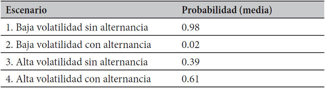 La segunda simulación también establece dos escenarios, pero en este caso la variable dependiente es la alternancia. Lo que se busca al endogeneizar la alternancia es observar cómo se comporta la probabilidad de que ésta ocurra ante cambios en los niveles de volatilidad. Esto permite verificar la relación entre ambos fenómenos, independientemente de su relación causal. Como ya mencionamos, nuestra hipótesis no postula estrictamente una relación de causalidad, sino que busca establecer cuál es la asociación entre volatilidad electoral y alternancia, como una forma de desestimar el argumento según el cual la volatilidad debe ser vista como un problema para el funcionamiento de los regímenes democráticos. Como puede apreciarse en el cuadro 5, en un escenario de baja volatilidad, la probabilidad de que exista alternancia es de 0.02 en promedio. Mientras, en un escenario con alta volatilidad, dicha probabilidad asciende a 0.61 en promedio. Esto implica que cuando existe baja volatilidad es casi un hecho que el partido en el gobierno ganará la elección. Sin embargo, cuando la volatilidad es alta es más probable que exista alternancia (0.61 contra 0.39), pero debemos ser más cautos con la afirmación, pues la diferencia entre las probabilidades no permite ser concluyente. Esta relación aparece ilustrada más claramente en el gráfico 5, en el cual se observan los valores de probabilidad para los escenarios 2 y 4 presentados en el cuadro 5.