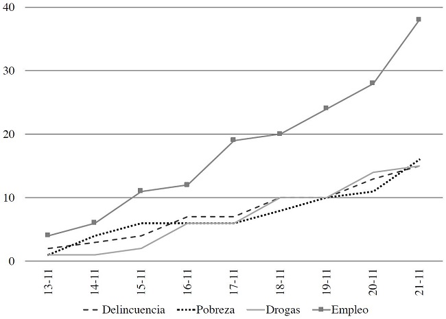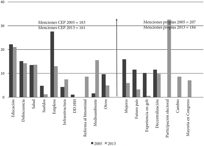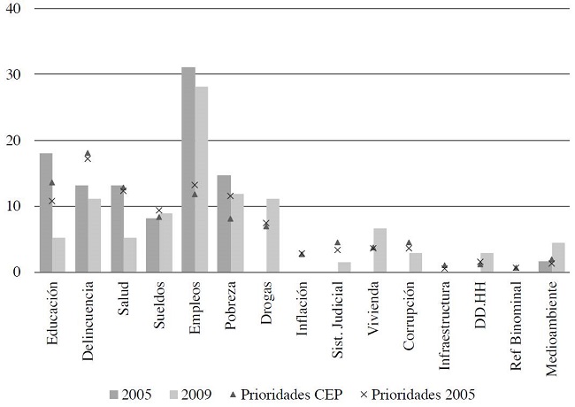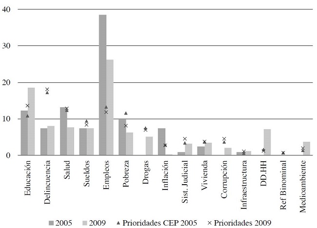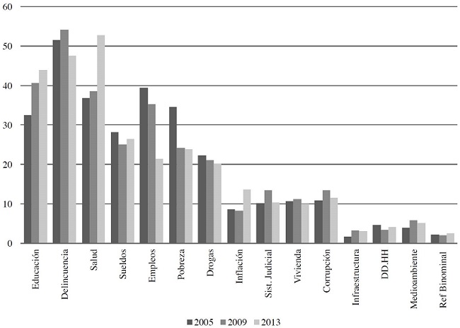 Como muestra el gráfico 1, los principales problemas identificados por la ciudadanía en 2005 en la Encuesta CEP fueron delincuencia, empleos y salud. Estos tres temas han estado constantemente entre las principales preocupaciones de la gente. De hecho, en 2009, la Encuesta CEP identifica los mismos problemas que en 2005. Dada la crisis económica de 2008-2009, ese año aumentó la preocupación por los indicadores económicos, como pobreza, empleos y sueldos. En 2013, junto a delincuencia y salud, educación fue uno de los tres principales problemas, posiblemente producto de las protestas estudiantiles de 2011.