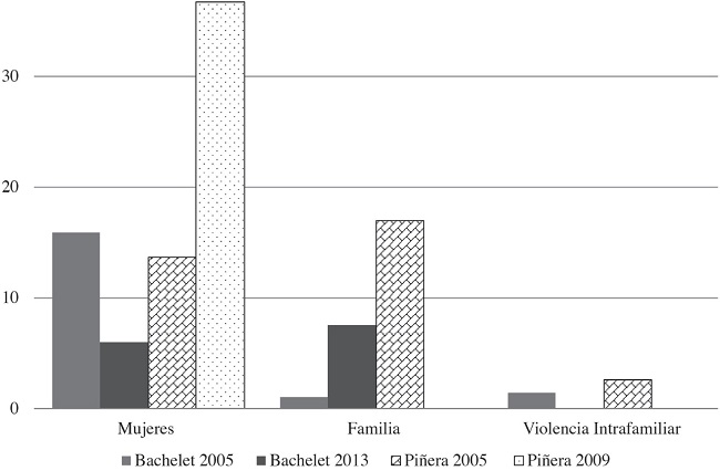 Tanto Bachelet en 2005 y 2013, como Piñera en 2005 se refirieron a la familia. En 2005 Bachelet registró 1% de alusiones, mientras que en 2013 se acercaron a 8%. Por su parte, las menciones relativas a temas familiares en la campaña de Piñera llegaron a 18%. Suponemos que esto se debe a que el candidato es conservador y a que en 2005 debía fortalecer sus bases en la derecha más dura, ya que competía contra un adversario del mismo sector, mientras que Bachelet en 2013 representó el cambio, posicionándose como la candidata de las grandes reformas. Finalmente, las menciones a violencia familiar sólo se registran en las campañas de 2005, y no superan 3%.