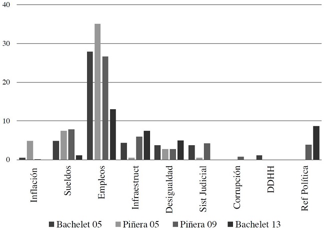 Hay suficiente evidencia para sugerir que Bachelet buscó potenciar la IO en ambas campañas, mientras que Piñera lo hizo en 2005, pero no así en 2009. Ahora bien, esto no quiere decir que Piñera carezca de dominancia sobre algunos temas. Es más, parece evidente que prefería hablar de empleo, más que de otros asuntos. Pero, dada su condición de empresario con experiencia en generar riqueza, la forma en que se refería al empleo, una prioridad reflejada también en la Encuesta CEP, le permitía ejercer una IO sobre este tema.