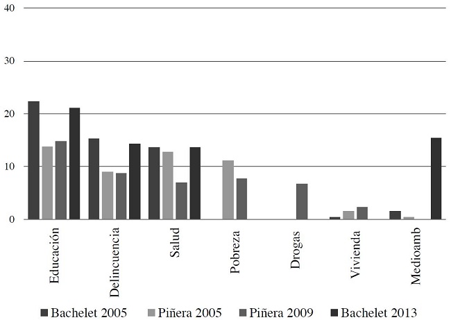 Curiosamente, pese a que no parecían ser prioridades en la Encuesta CEP, Piñera priorizó el medioambiente en 2009 y los derechos humanos en ambas elecciones. Si bien no fueron sus temas principales, éstos fueron más importantes en su campaña que en las preferencias del votante medio reflejadas en la Encuesta. Esto puede ser comprensible dado que en 2009 Piñera buscaba acercarse a los votantes moderados y marcar distancia respecto de las posturas tradicionales de la derecha en temas sensibles, como los derechos humanos.