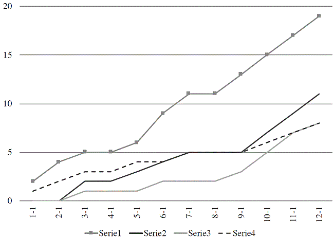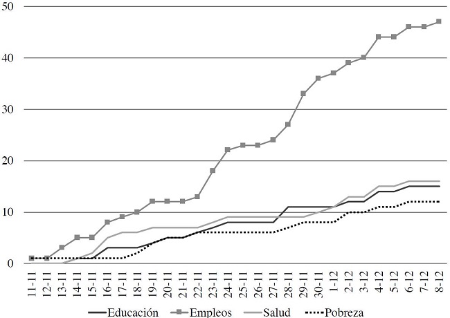 Los gráficos 4 y 5 muestran la acumulación diaria de menciones en la campaña televisiva de Piñera en 2005, mientras que los gráficos 6 y 7 lo hacen para la de 2009. Así, si el candidato habló tres veces de educación en el primer día y cinco en el segundo, el gráfico muestra ocho menciones a educación acumuladas hasta el segundo día. El gráfico 4 muestra que las relativas a empleo crecen rápidamente a medida que avanza la campaña en primera vuelta. Educación y salud se mueven de forma similar en toda la franja, alcanzando 15 menciones al término de la campaña de la primera vuelta. Pobreza es el tema que tiene menos se refiere entre los cuatro seleccionados, llegando a 12 menciones al final de la campaña.