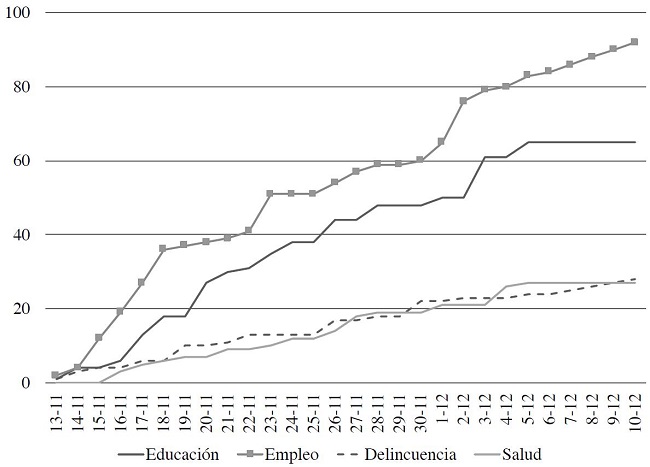 Los gráficos 6 y 7 muestran la evolución de las menciones de los cuatro temas CEP a los que más se refirió Piñera en la primera y segunda vuelta en 2009. Nuevamente, empleo fue la prioridad en la primera vuelta, alcanzando 92 menciones en los 28 días de campaña. Educación fue el segundo tema más relevante. El cambio en las prioridades de los asuntos tratados en la campaña de la primera vuelta de 2009 se debe al cambio de rivales. En 2009, Piñera enfrentaba a tres candidatos de izquierda. Delincuencia y salud superan las 20 menciones acumuladas en los primeros 28 días de franja televisiva. En la segunda vuelta, empleo alcanza las 38 menciones acumuladas, mientras que delincuencia, pobreza y drogas suman 15 alusiones.