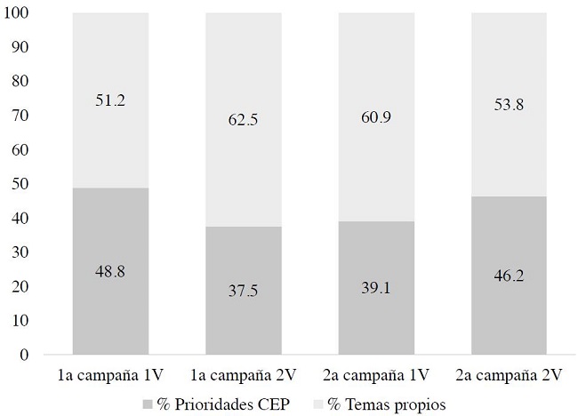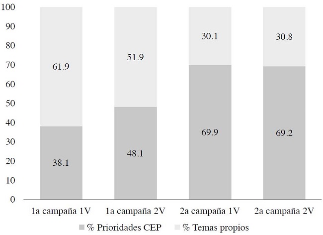 Nuestra segunda hipótesis sostiene que, en sus mensajes televisivos, los candidatos prefieren hablar de las prioridades propias más que de las nacionales. Para comprobar esta hipótesis comparamos el porcentaje de menciones a las prioridades nacionales reportadas en la Encuesta CEP con las propias de cada candidato, tanto en la primera como en la segunda vuelta de las campañas de Piñera y Bachelet. Como la Encuesta incluye 16 temas sobre los que presumiblemente todos los candidatos fijarán posturas, distinguimos entre prioridades nacionales y prioridades propias. En el segundo grupo debiesen estar los temas en los que los candidatos buscan tener predominio.