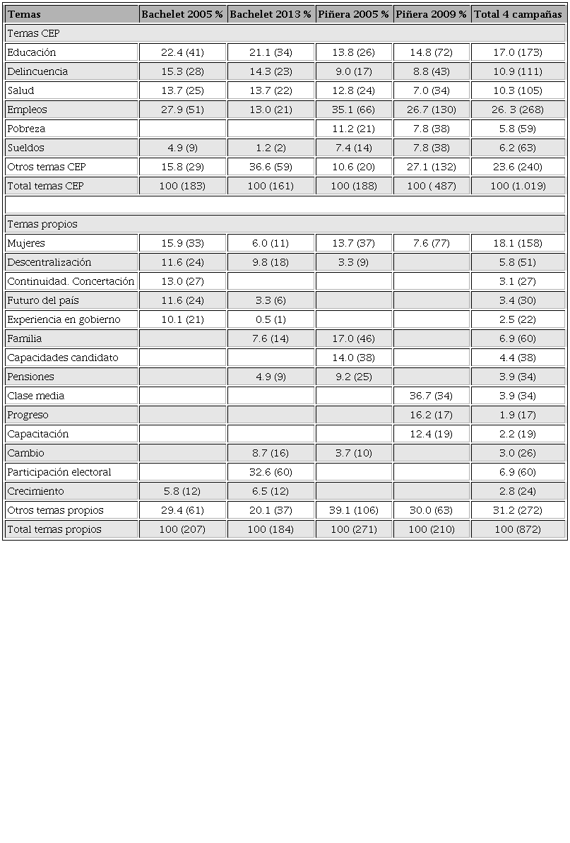 Examinamos los temas mencionados en las campañas televisivas de Bachelet, en 2005 y 2013, y de Piñera, en 2005 y 2009, para lo cual se analizan 37 924 segundos de spots en las cuatro campañas, identificando 1 885 menciones a distintos temas. Si bien los estudios sobre los temas de los spots suelen centrarse en sus efectos sobre el resultado de una elección, nosotros evaluamos los temas como variable dependiente y explicamos su varianza por las características de cada contienda electoral, por las prioridades que tiene la gente en cada año electoral y por las trayectorias y género de los candidatos.